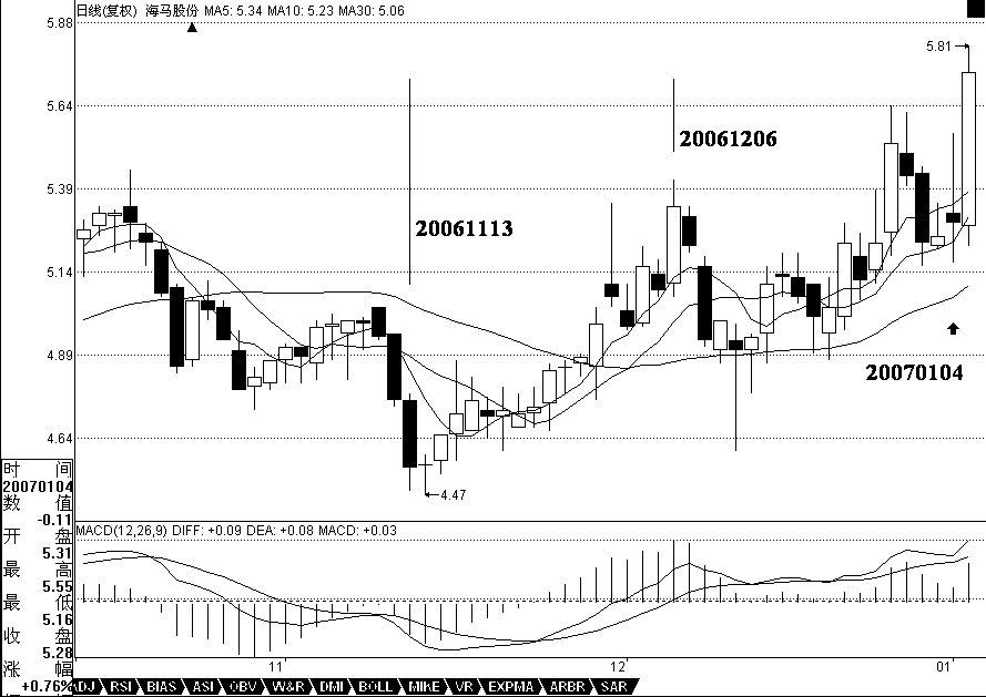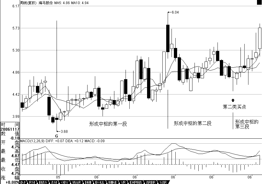 用最近漲得最厲害的一個股票來說明,000572。該股票的力度,其實是和他在日線與周線上出現(xiàn)雙重的第二類買點有關,相應地,就有了MACD雙重在0軸停留形成第一個中樞的情況。在周線上,該股從20051209到20060714,形成第一段,同時MACD也回到0軸上面。其后就開始形成第一個中樞,最終在20061117形成第二類買點,同時,黃白線在0軸附近橫盤。然后,開始逐步擺脫該中樞,黃白線也逐步拉起。在日線上,這個過程也是一樣的, 20061113到20061206,形成日線上的第一段,同時MACD回到0軸上面。然后三段回拉在20070104結束,形成第一個中樞,其后突破中樞,MACD在0軸附近拉起,擺脫第一個中樞。該股以后的走勢就很簡單了,首先形成一個至少是日線級別的新中樞,同時MACD回抽0軸,然后再突破,出現(xiàn)背馳,構成一個大調整,從而導致一個至少周線以上級別的中樞,使得MACD出現(xiàn)回拉0軸,然后再拉起來,出現(xiàn)背馳,其后的調整就大了去了,至少是月線級別的。