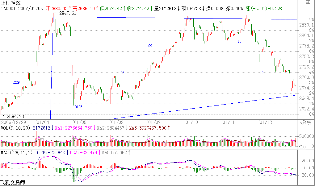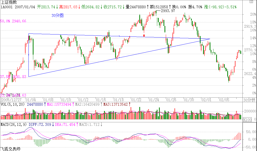 今天的走勢,都看到了,就是一個漢奸殺跌的過程,技術上很簡單,就是演化為一個復雜的調整.這在技術上是很正常的,理由前面已經說了,三角形后往往就是最后一段,但這只是30分鐘級別背馳引發(fā)的調整,2700點上下的中樞位置的波動就是所有了.